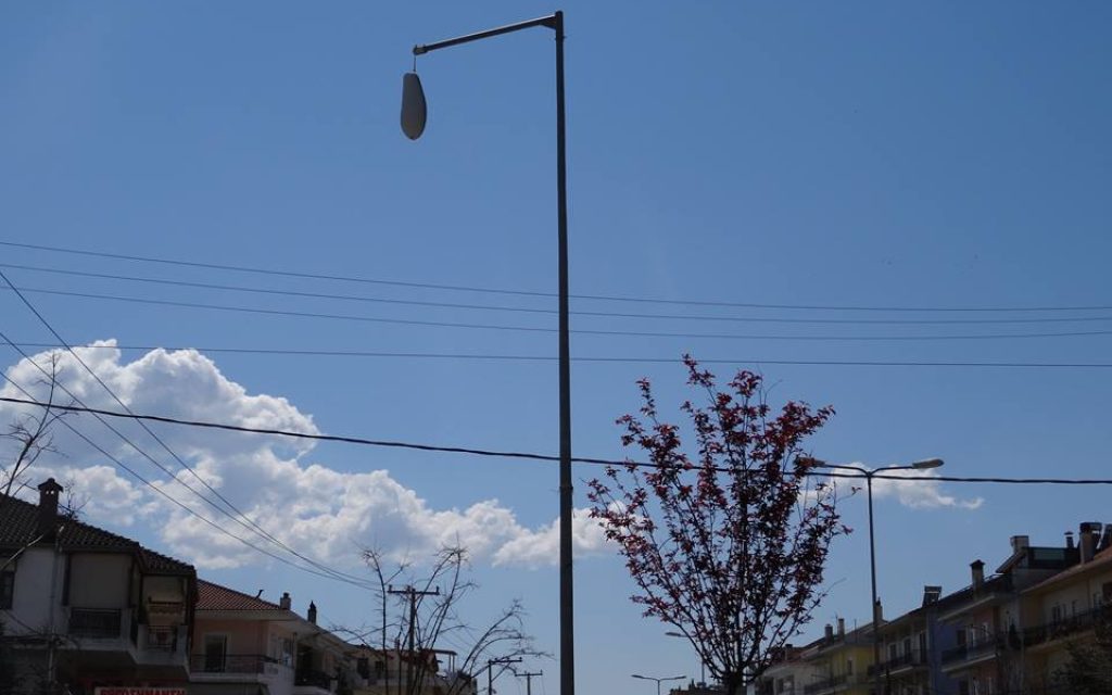 lampam2Ο στύλος της ΔΕΗ, όπου η λάμπα είναι κυριολεκτικά στον αέρα, βρίσκεται στη συμβολή των οδών Κατσάρη και Μακαρίου.
