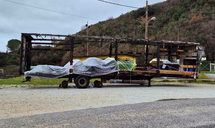 Εγκαταλειμμένη στην περιοχή της Τύριας παραμένει η καρότσα της νταλίκας και το φορτίο με τα συστατικά για σαπούνια και απορρυπαντικά,