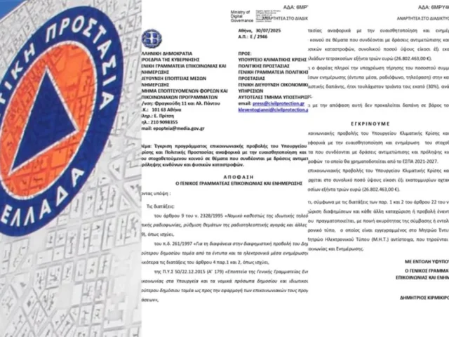 Πρόκειται για το περίφημο πρόγραμμα επικοινωνιακής προβολής με τίτλο «ευαισθητοποίηση και ενημέρωση για την αντιμετώπιση κινδύνων και φυσικών καταστροφών», χρηματοδοτούμενο από το ΕΣΠΑ 2021-2027, που ήδη έχει εγκριθεί από τη Γενική Γραμματεία Ενημέρωσης. Συγκεκριμένα, το ποσό που πρόκειται να ξοδευτεί ανέρχεται σε 26.802.463 ευρώ!