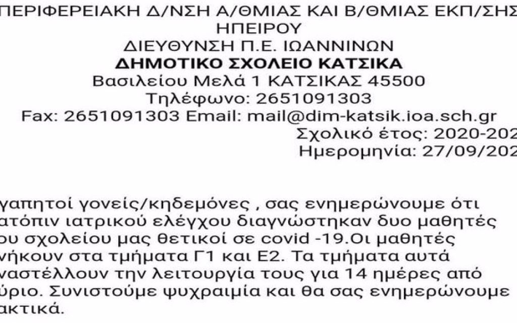 Αναστέλλεται η λειτουργία για δύο τμήματα στο Δημοτικό Σχολείο του Κατσικά καθώς δύο μαθητές βρέθηκαν στον Covid-19.