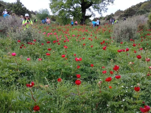 Οι άγριες παιώνιες, και ειδικά η Παιώνια η αρσενική (Paeonia mascula), κυριαρχούν στο τοπίο με τα εντυπωσιακά τους άνθη, διαμέτρου άνω των 10 εκατοστών. Φυτό πολυετές, ενδημικό σε πολλά βουνά της Ελλάδας, με ύψος που φτάνει τα 70-80 εκατοστά και μεγάλα παλαμοσχιδή φύλλα, η παιώνια αναπτύσσεται κυρίως σε μεσαία και μεγάλα υψόμετρα, ανθίζοντας κάθε άνοιξη για μικρό χρονικό διάστημα.