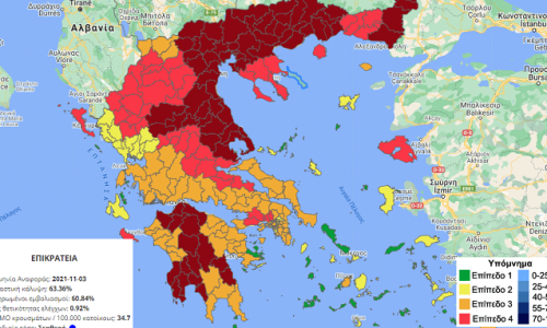 Πέντε επίπεδα έχει πλέον ο επιδημιολογικός χάρτης της χώρας καθώς προστέθηκε το βαθύ κόκκινο, επίπεδο στο οποίο βρίσκονται περιοχές της Θράκης, της Μακεδονίας, της Θεσσαλίας και της Πελοποννήσου.