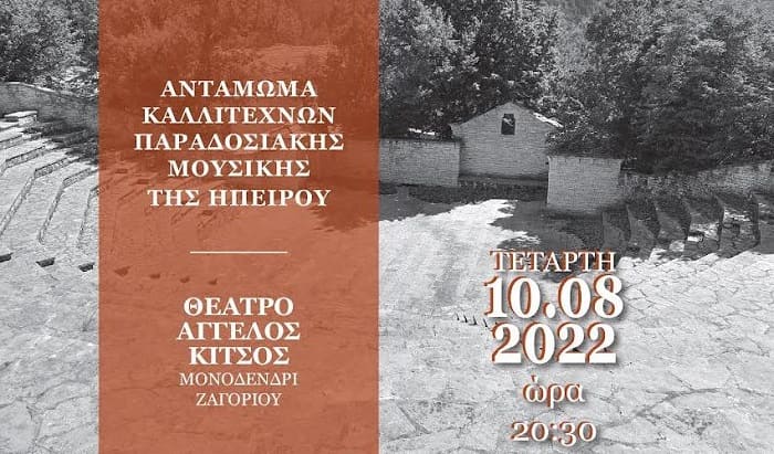 Το Διεθνές Κέντρο Ηπειρωτικής Μουσικής (ΔΙΚΗΜ) διοργανώνει μια συναυλία αυθεντικής ηπειρώτικης μουσικής την Τετάρτη 10 Αυγούστου, ώρα 20:30, στο εξαιρετικής ομορφιάς και αρχιτεκτονικής υπαίθριο θέατρο «Άγγελος Κίτσος» στο Μονοδένδρι Ζαγορίου, σε συνδιοργάνωση με την Περιφέρεια Ηπείρου, τον Δήμο Ζαγορίου και τον Πολιτιστικό Σύλλογο Κήπων Ζαγορίου «Η Μπάγια».