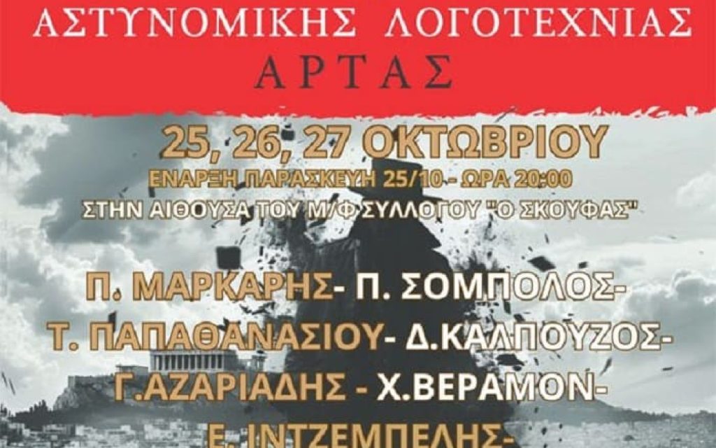 Ο Μουσικοφιλολογικός Σύλλογος “Σκουφάς”, σε συνδιοργάνωση με το Δήμο Αρταίων, την Κινηματογραφική Λέσχη Άρτας, τους Φίλους του Βιβλίου και άλλους πολιτιστικούς φορείς, διοργανώνει το 3ο Φεστιβάλ Αστυνομικής Λογοτεχνίας Άρτας. Το φεστιβάλ, που θα πραγματοποιηθεί στις 25, 26 και 27 Οκτωβρίου, υπόσχεται ένα συναρπαστικό πρόγραμμα με παρουσιάσεις, προβολές, θεατρικά δρώμενα και δημιουργικές δραστηριότητες για μικρούς και μεγάλους.