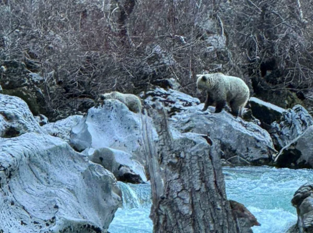 Η συγκεκριμένη εικόνα, που απαθανατίστηκε πριν μερικούς μήνες, κατά την διάρκεια του χειμώνα, δείχνει μία αρκούδα με το μικρό της να ψαρεύει στον Αώο, απέναντι και κοντά σε μία από τις τσιμεντώσεις της κοίτης του ποταμού..