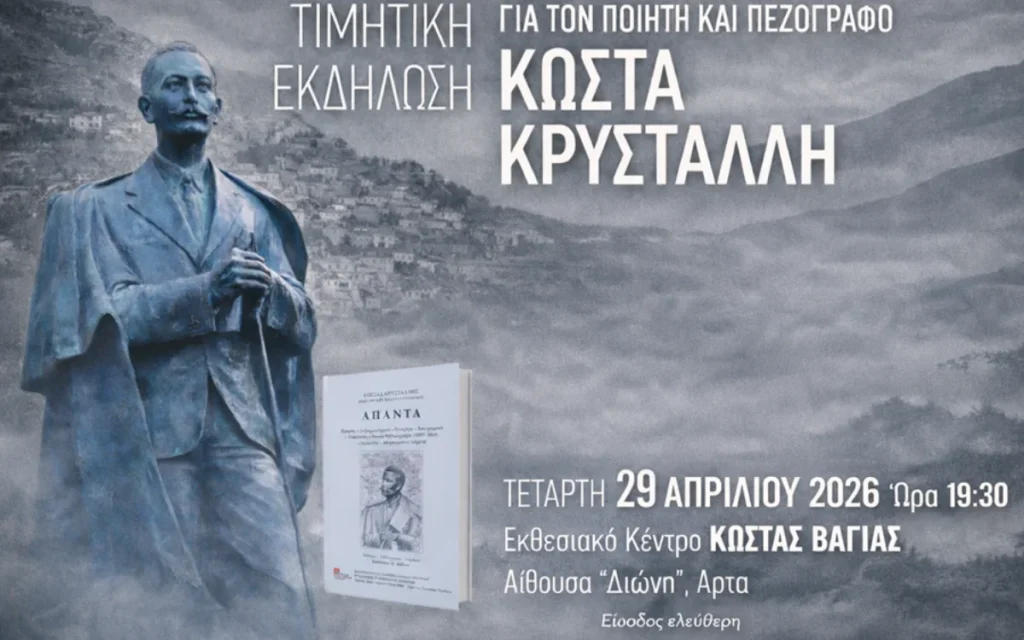 Μια εμβληματική μορφή των ελληνικών γραμμάτων και της ηπειρωτικής παράδοσης, ο Κώστας Κρυστάλλης, τιμάται την Τετάρτη 29 Απριλίου στην Άρτα.