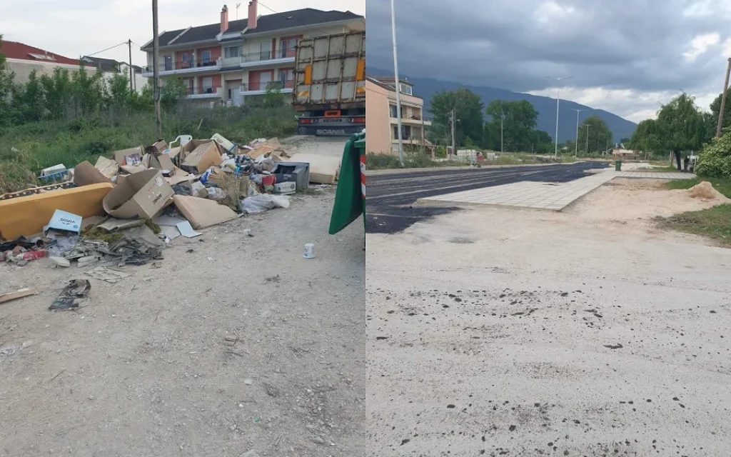 Από τη μία, ένας ολοκαίνουργιος δρόμος, στρώνεται με άσφαλτο – σύμβολο προόδου και ανάπτυξης. Από την άλλη, ένας σωρός από ογκώδη, σκουπίδια και ό,τι άλλο έκρινε κάποιος ότι δεν χρειάζεται στο σπίτι του..