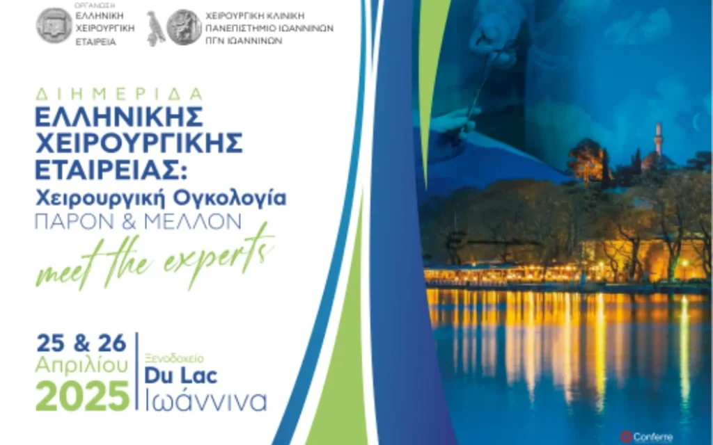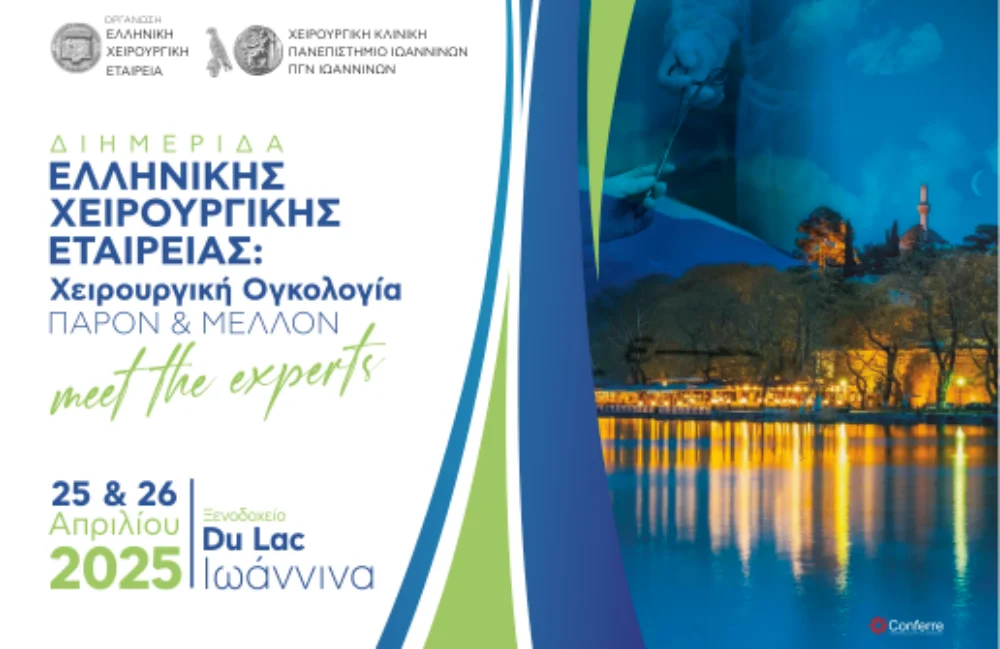 Η Χειρουργική Κλινική του Πανεπιστημίου Ιωαννίνων σε συνεργασία με την Ελληνική Χειρουργική Εταιρεία διοργανώνουν διημερίδα με τίτλο «Χειρουργική Ογκολογία – Παρόν και Μέλλον», που θα πραγματοποιηθεί στις 25 & 26 Απριλίου 2025 στο Ξενοδοχείο Du Lac στα Ιωάννινα.