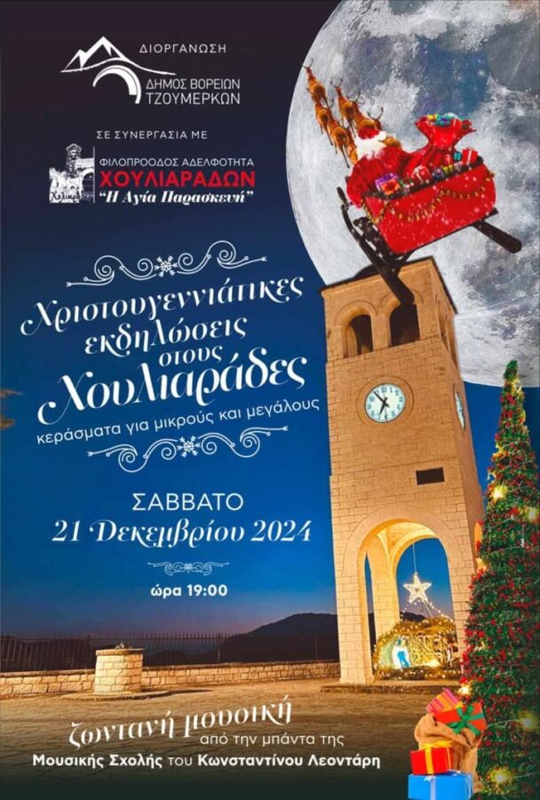 Μία όμορφη χριστουγεννιάτικη γιορτή οργανώνει ο Δήμος Βορείων Τζουμέρκων στους Χουλιαράδες, στην έδρα της Δημοτικής Ενότητας Τζουμέρκων, το Σάββατο 21 Δεκεμβρίου, στις 7 το απόγευμα.