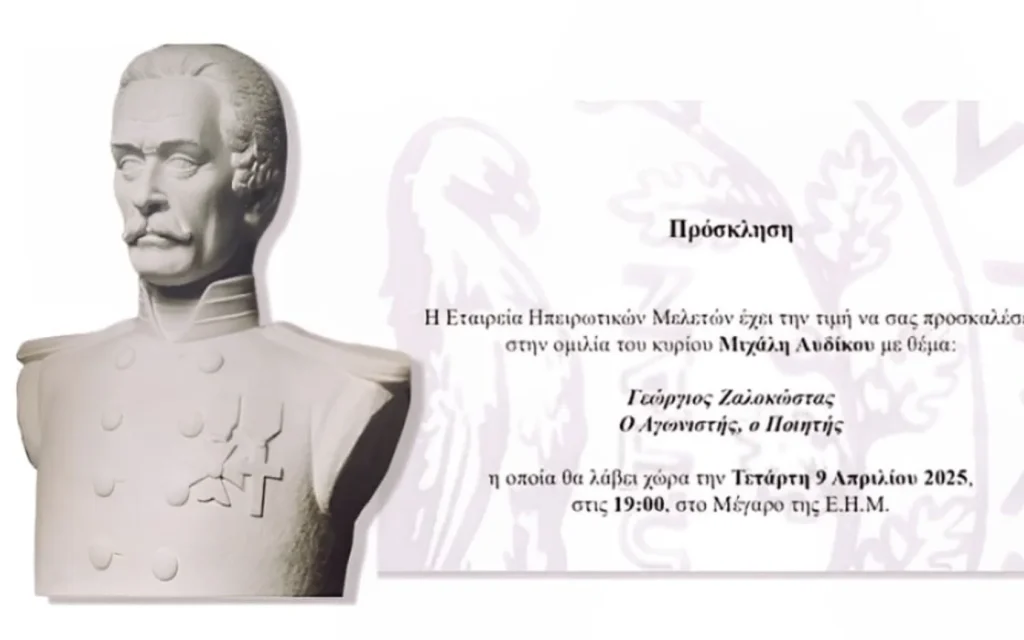 Η Εταιρεία Ηπειρωτικών Μελετών συνεχίζει τις σημαντικές πολιτιστικές και επιστημονικές δράσεις της, φιλοξενώντας την Τετάρτη 9 Απριλίου 2025, στις 19:00, στο Μέγαρο της, διάλεξη του καθηγητή και συγγραφέα Μιχάλη Αυδίκου με θέμα «Γεώργιος Ζαλοκώστας – Ο Αγωνιστής, ο Ποιητής».