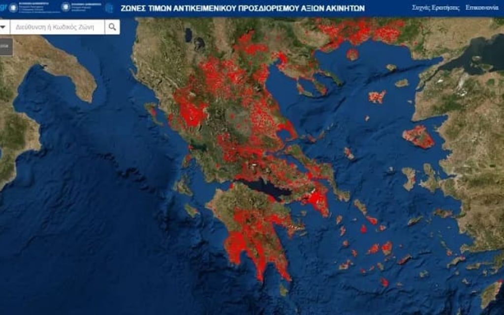 Αποτύπωση των ζωνών του αντικειμενικού προσδιορισμού αξιών ακινήτων με μοναδική κωδικοποίησή τους πάνω στον δορυφορικό χάρτη της Ελλάδος.