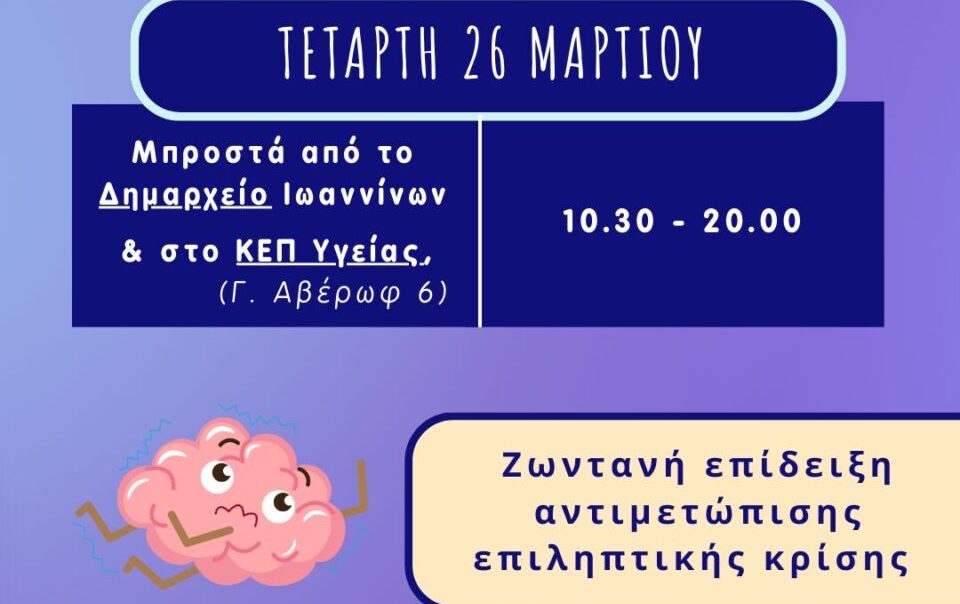 Στο πλαίσιο της ημέρας αυτής, θα πραγματοποιηθεί ολοήμερη ενημερωτική δράση την Τετάρτη 26 Μαρτίου, από τις 10:30 έως τις 20:00, με σκοπό την ενημέρωση και την ευαισθητοποίηση του κοινού γύρω από την επιληψία, μια νόσο που επηρεάζει 1 στους 26 συμπολίτες μας.