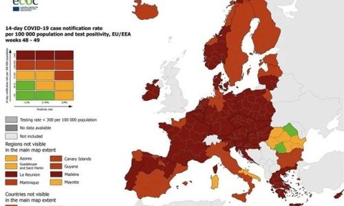 Στο χάρτη του ECDC, ο οποίος «φωτογραφίζει» την επιδημιολογική κατάσταση στην Ευρώπη, μεγάλο μέρος της Γηραιάς Ηπείρου βυθίζεται στο «κόκκινο» στον σύνθετο δείκτη, ο οποίος περιλαμβάνει στοιχεία για κρούσματα κορωνοϊού, θετικότητα και ρυθμό τεστ.