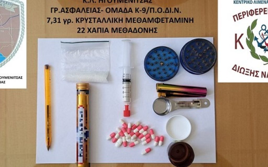 Στη συνέχεια σε έλεγχο που πραγματοποιήθηκε εντός του ΙΧΕ οχήματος που οδηγούσε, εντοπίστηκε επιμελώς κρυμμένη ναρκωτική ουσία πιθανόν κρυσταλλικής μεθαμφεταμίνης συνολικού μικτού βάρους επτά γραμμαρίων και τριάντα ενός δεκάτων του γραμμαρίου (7,31gr), ενώ σε χειραποσκευή που έφερε εντοπίστηκαν ένα (πλαστικό κουτί περιέχον είκοσι δύο δισκία ναρκωτικής ουσίας πιθανόν μεθαδόνης χωρίς την απαιτούμενη ιατρική συνταγή, μία σύριγγα χωρίς βελόνα περιέχουσα άγνωστη λευκή υγρή ουσία ποσότητας 4,2 ml καθώς και σύνεργα χρήσης ναρκωτικών ουσιών (1 μεταλλικό κουτάλι, 1 αναπτήρας και 1 τρίφτης κανναβιδοειδών).