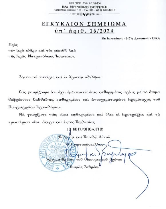«Αγαπητοί πατέρες και εν Χριστώ αδελφοί… Έχει εμφανιστεί ένας καθηρημένος ιερέας με το όνομα Ευφρόσυνος Σαββαϊτης, καθηρημένος και αποσχηματισμένος ιερομόναχος του Πατριαρχείου Ιεροσολύμων. Να γνωρίζετε πως είναι καθηρημένος και όλες οι ιεροπραξίες και τα «μυστήρια» είναι άκυρα και εκτός Εκκλησίας» αναφέρει στην σχετική του εγκύκλιο ο Μητροπολίτης.