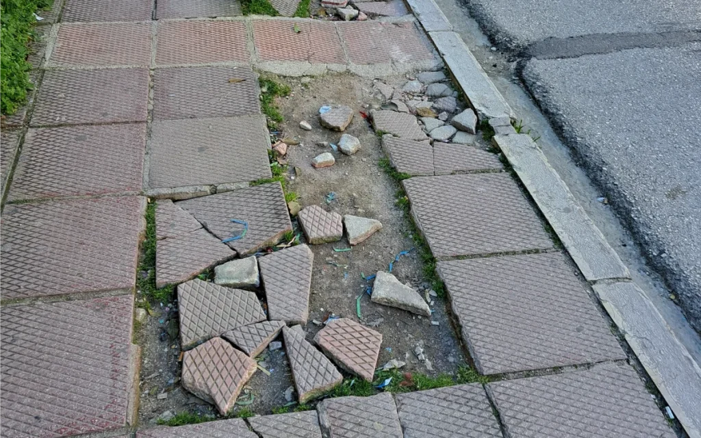 Το πεζοδρόμιο έχει μετατραπεί σε «παγίδα» για ανυποψίαστους περαστικούς, με τις σπασμένες πλάκες να συνθέτουν… λαογραφικό μωσαϊκό της σύγχρονης αδιαφορίας.
