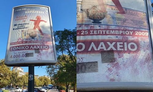 Η γιγαντοαφίσα διαφημίζει το Εθνικό Λαχείο και τις κληρώσεις που ξεκινούν στις 24 και 25 Σεπτεμβρίου.