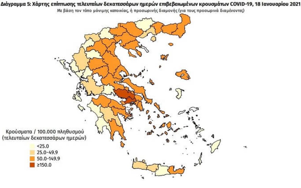 Άρτα, Πρέβεζα και Θεσπρωτία είναι σχεδόν λευκοί που σημαίνει ότι τα κρούσματα των τελευταίων δύο εβδομάδων είναι λιγότερα από 25 ανά εκατό χιλιάδες πληθυσμού.