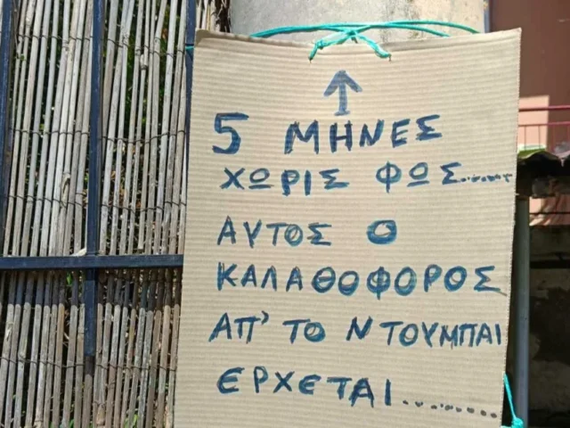 Κάποιοι στους Σελλάδες αγανάκτησαν περιμένοντας μήνες την αντικατάστασης μιας λάμπας. Και την έκαναν πινακίδα την αγανάκτηση τοποθετώντας ένα χαρτόνι στην κολώνα..