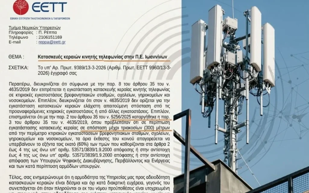 Τι σημαίνει αυτό για τα Γιάννενα; Μέχρι πέρυσι, αν μια κεραία έμπαινε δίπλα σε σχολείο, η εταιρεία ήταν υποχρεωμένη να μειώσει την ακτινοβολία σχεδόν στο μισό.