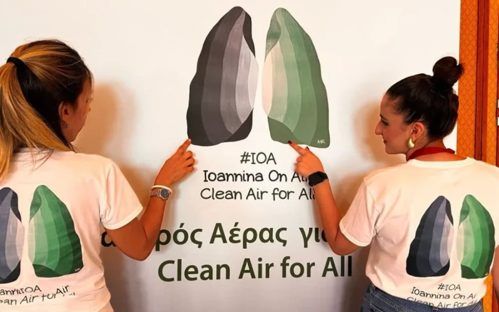 Η Αλεξάνδρα Λάζου και ο Ελευθέριος Γιάννης τόνισαν «Στα Ιωάννινα, την πόλη που σπουδάζουμε, με τη μαγεία της λίμνης και το πράσινο που μας περιβάλλει, αξίζει να αναπνέουμε καθαρό αέρα. Η ατμοσφαιρική ρύπανση μας αφορά όλους και είναι στο χέρι μας να τη μειώσουμε!».