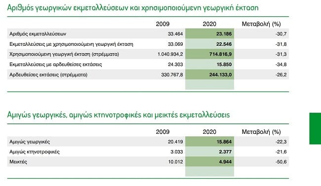 Οι αμιγώς γεωργικές εκμεταλλεύσεις μειώθηκαν κατά 22%, οι αμιγώς κτηνοτροφικές κατά 21% και οι μεικτές κατά 50%.