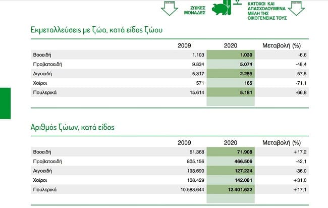 Ωστόσο σε απόλυτους αριθμούς υπάρχει αύξηση ζωικού κεφαλαίου στα πουλερικά και τους χοίρους ενώ και έχει μειωθεί κατά πολύ ο αριθμός προβάτων και αιγών.
