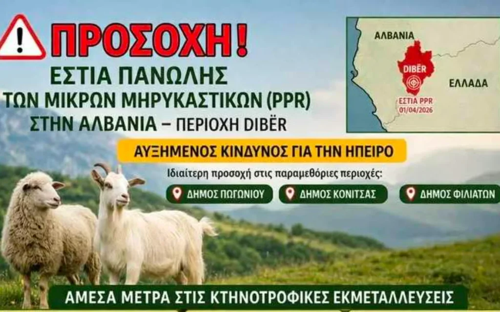 Η Κτηνιατρική Υπηρεσία της Περιφέρειας Ηπείρου προειδοποιεί ότι η πανώλη των Μικρών Μηρυκαστικών είναι μια εξαιρετικά μεταδοτική ιογενής νόσος που απειλεί άμεσα το ζωικό κεφάλαιο. Οι αρχές απευθύνουν έκκληση για άμεσα μέτρα βιοασφάλειας στις εκτροφές, καθώς ο κίνδυνος εισόδου της νόσου στην Ήπειρο θεωρείται αυξημένος.