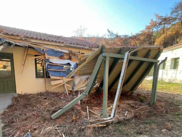 Την ημέρα εκείνη πήγε κι ο εργολάβος που ανέλαβε εργασίες καθαρισμού και κόβοντας ένα δέντρο κατέστρεψε ολοσχερώς το στέγαστρο στην είσοδο του κτιρίου και μέρος της στέγης του κυρίως χώρου.