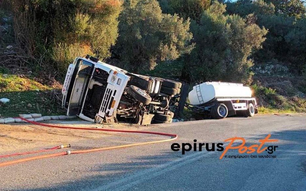 Κομμένη στα δύο παραμένει η Εθνική Οδός Ηγουμενίτσας- Πρέβεζας μετά το τροχαίο που έγινε την νύχτα με την εκτροπή βυτιοφόρου που μετέφερε καύσιμα.