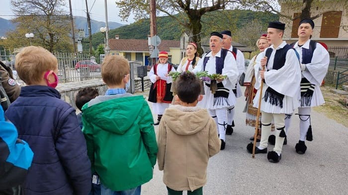 Από τις πρώτες πρωινές ώρες σήμερα, άνδρες, γυναίκες και μικρά παιδιά, φορώντας παραδοσιακές στολές, χωρισμένοι σε πέντε ομάδες και με κυπριά και κουδούνια, έλεγαν πένθιμα τα “κάλαντα της Μεγάλης Παρασκευής” , πόρτα πόρτα, σε όλα τα σπίτια του χωριού, με τους νοικοκυραίους να τους φιλεύουν με αβγά και κουλούρια.