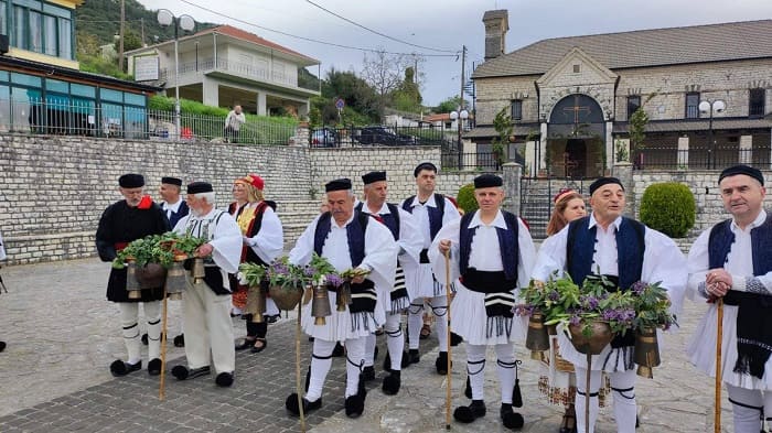 Τα γνωστά κουδούνια, στολισμένα με λουλούδια, συνοδεύουν το μοιρολόι… Η ανταμοιβή είναι κουλούρια, αβγά, αλλά και χρήματα για την ενίσχυση του Συλλόγου.