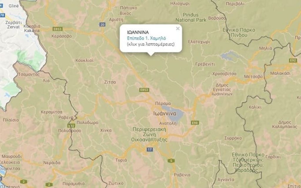 Πατώντας λοιπόν τα Ιωάννινα βλέπουμε ότι το επίπεδο προληπτικών μέτρων είναι χαμηλό και συνεχίζοντας στο πεδίο «λεπτομέρειες» βλέπουμε τα μέτρα που ισχύουν στην περιοχή τα οποία δεν έχουν επικαιροποιηθεί στο σύνολό τους καθώς ο χάρτης θα είναι πλήρως χρηστικός την Παρασκευή.