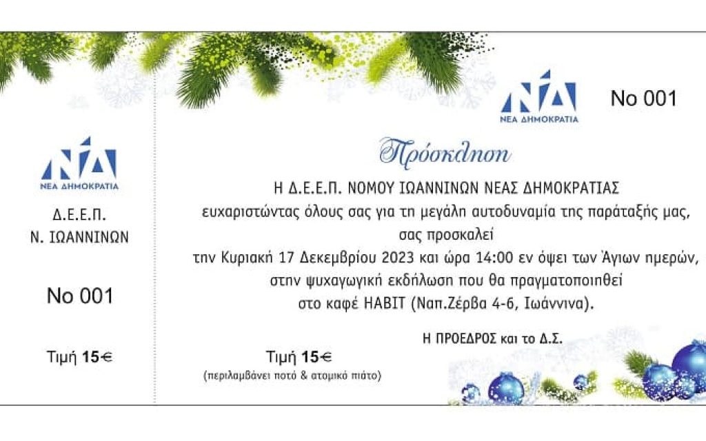 Η τιμή της πρόσκλησης είναι 15 € (περιλαμβάνει ποτό και ατομικό πιάτο).
