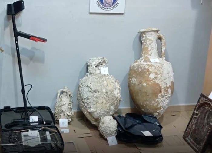 Από την περαιτέρω έρευνα προέκυψε και η εμπλοκή του 64χρονου στην υπόθεση, ο οποίος επίσης συνελήφθη καθώς είχε προγραμματίσει αγοραπωλησία δύο αμφορέων με 48χρονο αλλοδαπό, ο οποίος περιλαμβάνεται στη δικογραφία και αναζητείται.