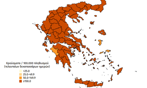 Στο σκούρο πορτοκαλί του χάρτη που συνοδεύει την ημερήσια έκθεση του ΕΟΔΥ βρίσκεται όλη η Ήπειρος όπως και οι περισσότερες περιοχές της Ελλάδας.