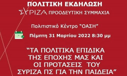 Ο ΣΥΡΙΖΑ όμως διάλεξε άλλη θεματολογία… Συζητά στην Πρέβεζα για «τα πολιτικά επίδικα της εποχής μας και τις προτάσεις για την παιδεία» παρόντος μάλιστα του πρώην Υπουργού Παιδείας Κώστα Γαβρόγλου –αρχιτέκτονα της ανωτατοποίησης των ΤΕΙ- και της αναπληρωτή τομεάρχη παιδείας Μερόπης Τζούφη.