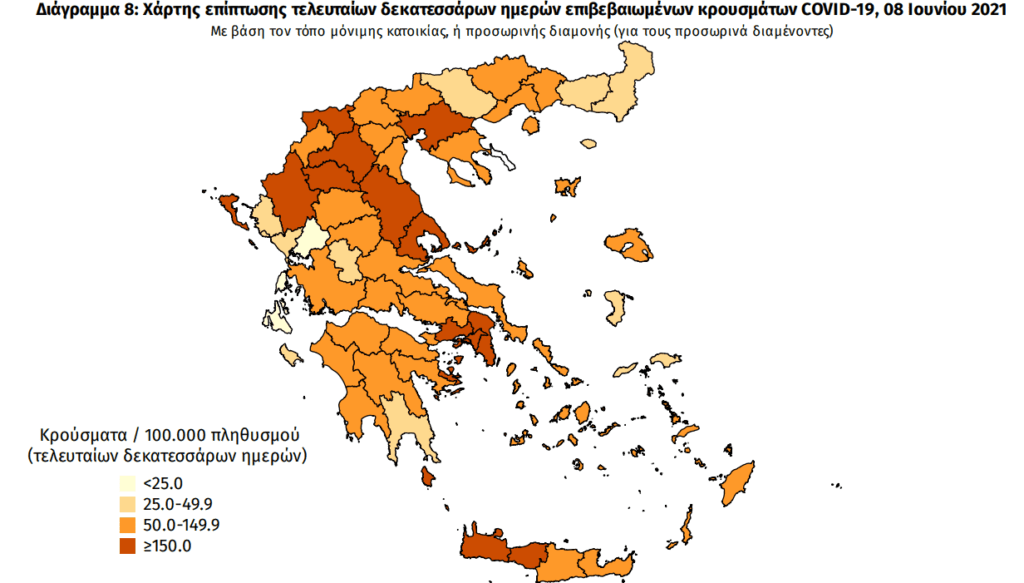 Το σκούρο πορτοκαλί χρώμα σημαίνει ότι τα κρούσματα των τελευταίων 14 ημερών ανά εκατό χιλιάδες πληθυσμού υπολογίζονται σε περισσότερα από 150.