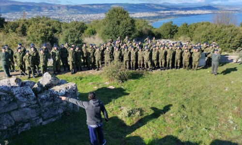 Πάνω από 100 νεοσύλλεκτοι με τα στελέχη του Τάγματος βρέθηκαν στην ακρόπολη και τα αρχαιολογικά μονοπάτια όπου ενημερώθηκαν για την ιστορία του χώρου και τις εργασίες που έχουν γίνει τα προηγούμενα χρόνια για την ανάδειξή του.