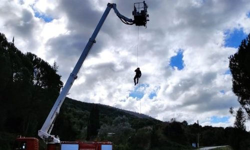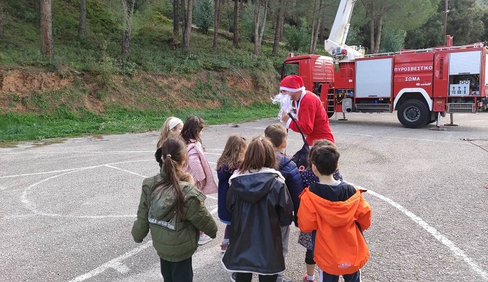 Τα παιδιά του νηπιαγωγείου έκπληκτα είδαν τον Άη Βασίλη να κατεβαίνει με το γερανοφόρο της Πυροσβεστικής και στη συνέχεια να ανοίγει το σάκο του για να μοιράσει δώρα.