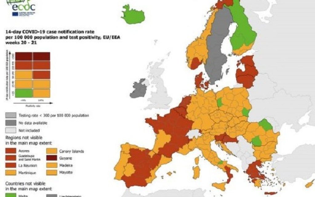 Στον συνδυαστικό χάρτη του ECDC με δεδομένα των δύο τελευταίων εβδομάδων (27 Μαΐου-3 Ιουνίου) που αφορούν στον δείκτη τεστ, τα νέα κρούσματα και τον δείκτη θετικότητας, το μεγαλύτερο μέρος της Ελλάδας είναι στο «πορτοκαλί», εκτός από νησιά στο βόρειο Αιγαίο, αλλά και το μεγαλύτερο μέρος της Πελοποννήσου, που βρίσκονται στο «κίτρινο».