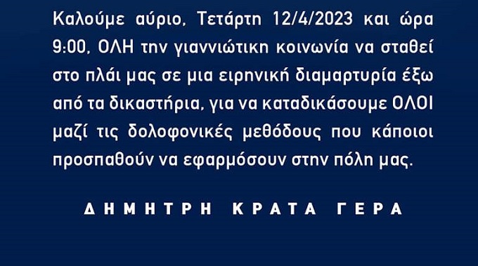 «Καλούμε την Τετάρτη 12/4/2023 και ώρα 9:00, ΟΛΗ την γιαννιώτικη κοινωνία να σταθεί στο πλάι μας, σε μια ειρηνική διαμαρτυρία έξω από τα δικαστήρια, καταδικάζοντας  ΟΛΟΙ ΜΑΖΙ τις δολοφονικές μεθόδους που κάποιοι προσπαθούν να εφαρμόσουν στην πόλη μας» αναφέρει.