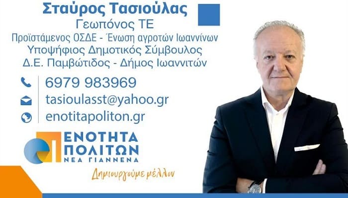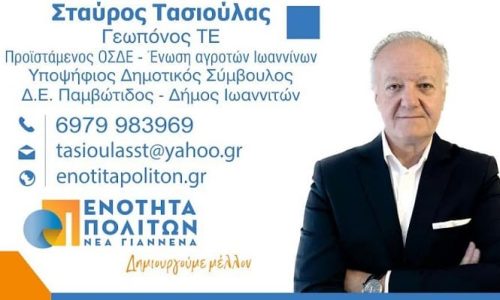 Υποψήφιος με την παράταξη «Ενότητα Πολιτών- Νέα Γιάννενα» με επικεφαλής τον Θωμά Μπέγκα, είναι ο Σταύρος Τασιούλας. Ο Σταύρος Τασιούλας κατέρχεται στη Δημοτική Ενότητα Παμβώτιδας, όπου αποτελεί τον τόπο καταγωγής του.