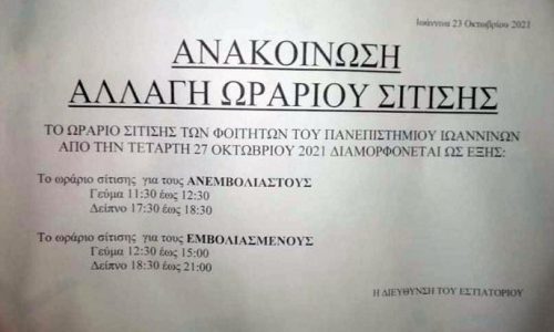 Το ωράριο για την εξυπηρέτηση άλλαξε γεγονός που προκαλεί αντιδράσεις καθώς οι ανεμβολίαστοι έχουν στην διάθεσή τους μία ώρα για το γεύμα, από τις εντεκάμισι ως τις δωδεκάμισι και μία ώρα για το δείπνο που είναι από τις πεντέμισι ως τις εξίμισι το απόγευμα.