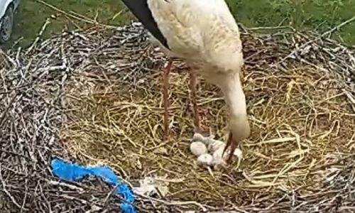 Το πρωί της Κυριακής η οικογένεια των πελαργών μεγάλωσε. Οι δύο πρώτοι νεοσσοί, μετά από τις απαιτούμενες μέρες εκκόλαψης, βγήκαν από τα αυγά τους και δέχονται την περιποίηση των γονιών τους.