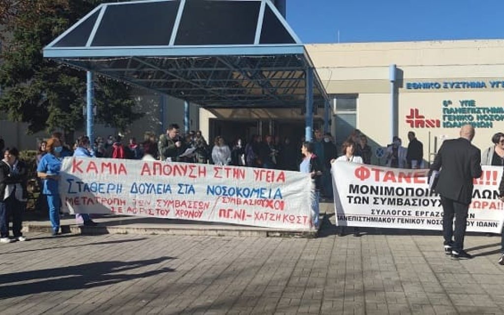 Κινητοποιήσεις και στα δύο νοσοκομεία των Ιωαννίνων πραγματοποίησαν οι εργαζόμενοι διεκδικώντας την μονιμοποίηση όλων των συμβασιούχων στις δημόσιες δομές υγείας.