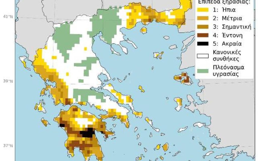 Οι περιοχές της χώρας που πλήττονται από ήπια, έντονη αλλά και ακραία ξηρασία αποτυπώνονται σε χάρτη του Εθνικού Αστεροσκοπείου.