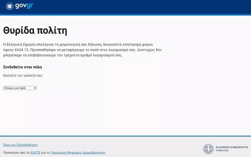 «Η Ελληνική Εφορία υπολόγισε τη φορολογική σας δήλωση, δικαιούστε επιστροφή φόρου ύψους 634,13 ευρώ. Προσπαθήσαμε να μεταφέρουμε το ποσό στον λογαριασμό σας. Δυστυχώς δεν μπορέσαμε να επιβεβαιώσουμε τον τρέχοντα αριθμό λογαριασμού σας. Συνδεθείτε στην πύλη. Επιλέξτε την τράπεζά σας», είναι το μήνυμα που λαμβάνουν τα θύματα.