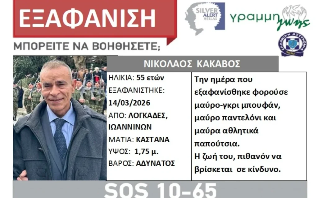 Σε κατάσταση συναγερμού βρίσκονται οι αρχές και οι εθελοντικές ομάδες για τον εντοπισμό του 55χρονου Νικόλαου Κάκαβου, ο οποίος εξαφανίστηκε από την περιοχή των Λογγάδων Ιωαννίνων.