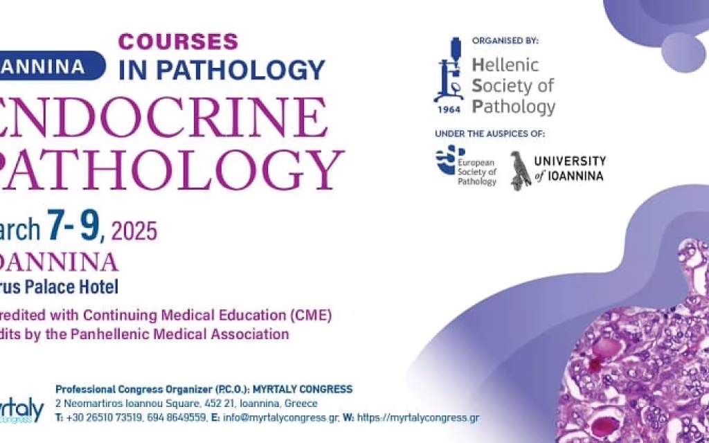 Από 7 έως 9 Μαρτίου 2025, θα πραγματοποιηθεί στα Ιωάννινα και συγκεκριμένα στο ξενοδοχείο «Epirus Palace»,το καθιερωμένο Ευρωπαϊκό Μετεκπαιδευτικό Σεμινάριο Παθολογικής Ανατομικής Ioannina University Coursesin Pathology – IUCP 2025), με θέμα«Endocrine Pathology».